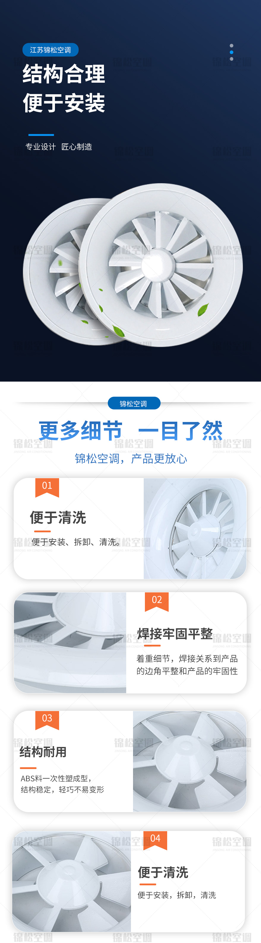 旋流风口用于高大空间送风,射程远。常用于顶送风,可电动或手动调节送风风量。面板为冷轧镀锌钢板,散流圈为深拉冲压铝制件,表面为纯白色(RAL9010)漆。
